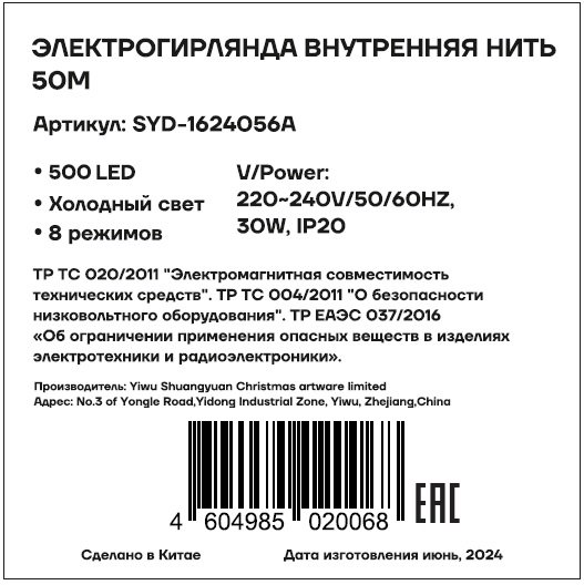 - Электрогирлянда внутренняя Нить 50м 500LED, IP20, 220V, холодный белый, контроллер 8 режимов, SYD-1624056A