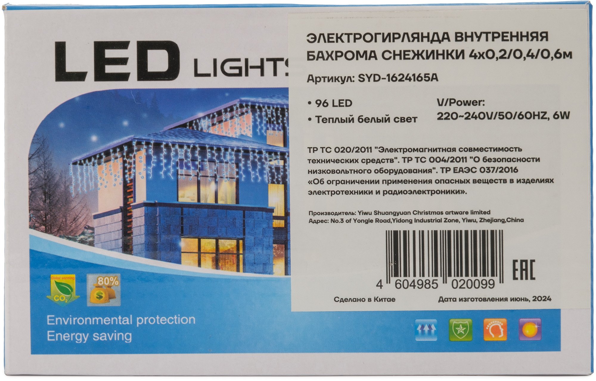 Встречайте нашу уникальную новогоднюю электрогирлянду «Бахрома Снежинки»! Её длина составляет 4 метра в трёх вариантах размеров: 0,2, 0,4 и 0,6 метра. Эта гирлянда оснащена 96 яркими светодиодами тёплого белого цвета, что создаёт уютную и тёплую атмосферу.