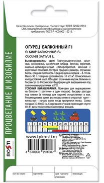 -30%Раннеспелый (41 день) партенокарпический гибрид, женского типа цветения. Зеленец короткий овально-цилиндрический, средне - бугорчатый, массой около 90 г, вкус отличный. Устойчив к ВОМ 1, кладоспориозу, МР толерантен к ЛМР. Отлично подходит для выращивания в контейнерах Использование: салатный, консервный, засолочный. Относительно холодостойкий.