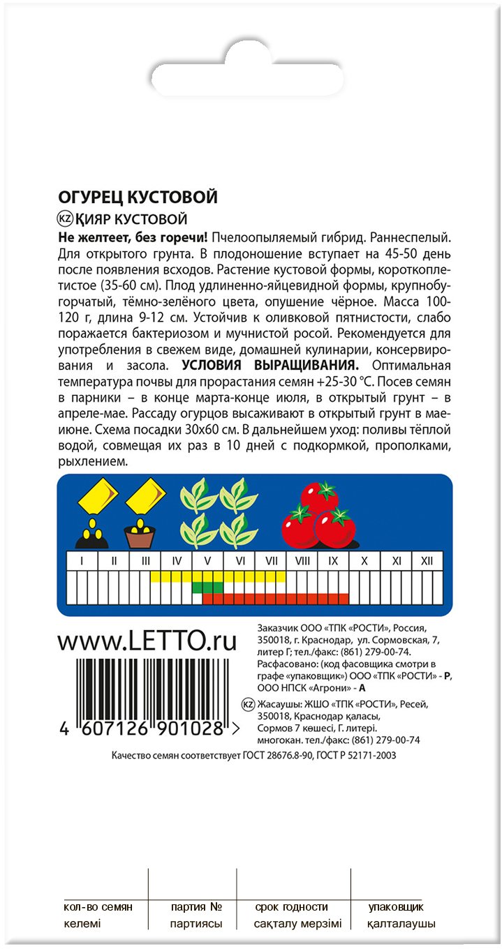 -30%Пчелоопыляемый гибрид. Раннеспелый. Для открытого грунта. В плодоношение вступает на 45-50 день после появления всходов. Растение кустовой формы, короткоплетистое (35-60 см). Плод удлиненно-яйцевидной формы, крупнобугорчатый, темно-зелёного цвета, опушение черное. Масса 100-120 г, длина 9-12 см. Устойчив к оливковой пятнистости, слабо поражается бактериозом и мучнистой росой. Рекомендуется для употребления в свежем виде, домашней кулинарии, консервирования и засола.