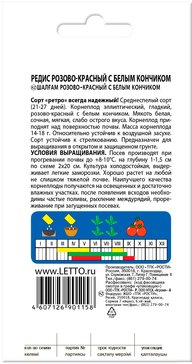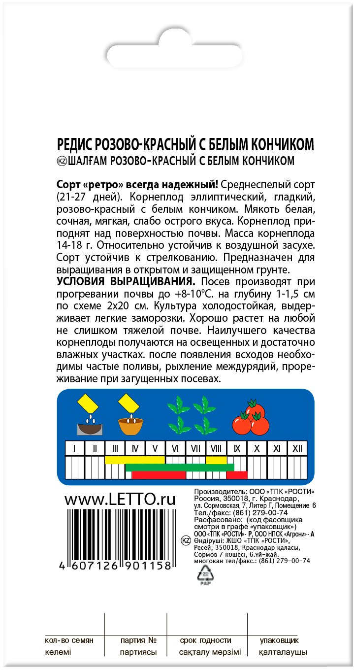 -39%Сорт «ретро» всегда надежный. Среднеспелый сорт (21-27 дней). Корнеплод эллиптический, гладкий, розово-красный с белым кончиком. Мякоть белая, сочная, мягкая, слабо острого вкуса. Корнеплод приподнят над поверхностью почвы. Масса корнеплода 14-18 г. Относительно устойчив к воздушной засухе. Сорт устойчив к стрелкованию. Предназначен для выращивания в открытом и защищенном грунте.