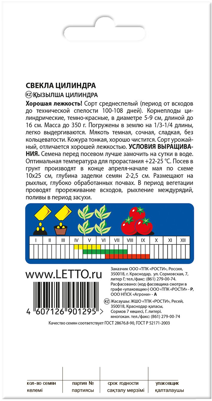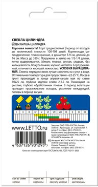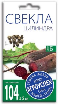 -30%Сорт среднеспелый (период от всходов до технической спелости 100-108 дней). Корнеплоды цилиндрические, темно-красные, в диаметре 5-9 см., длиной до 16 см. Масса до 350г. Погружены в землю на 1/3-1/4 длины, легко выдергиваются. Мякоть темная, сочная, сладкая, без кольцеватости. Кожура тонкая, хорошо чистится. Сорт урожайный, отличается хорошей лежкостью, экономит площадь посевов.