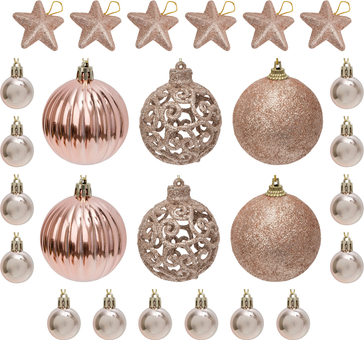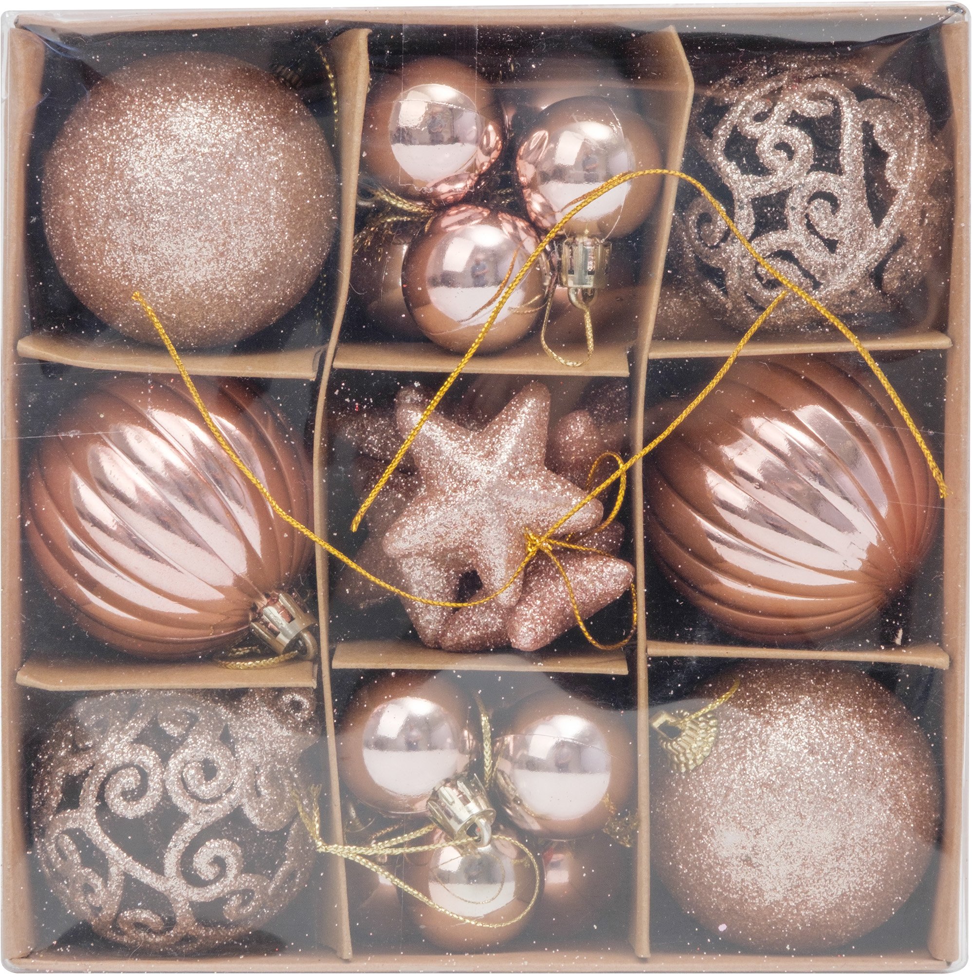 Представьте: нежные переливы розового золота на ветвях ёлки, игра света на глянцевых поверхностях, утончённые формы, создающие атмосферу роскоши и уюта. Этот набор превратит праздничное оформление в настоящее произведение искусства — достаточно развесить украшения, чтобы пространство наполнилось волшебным сиянием.