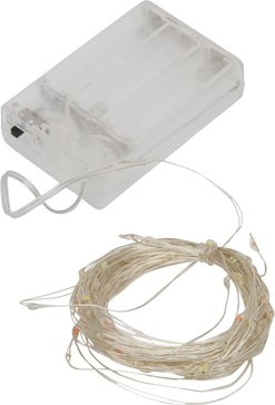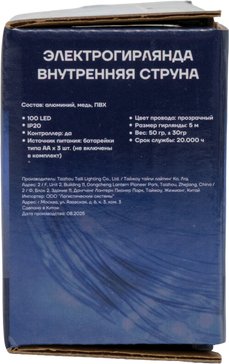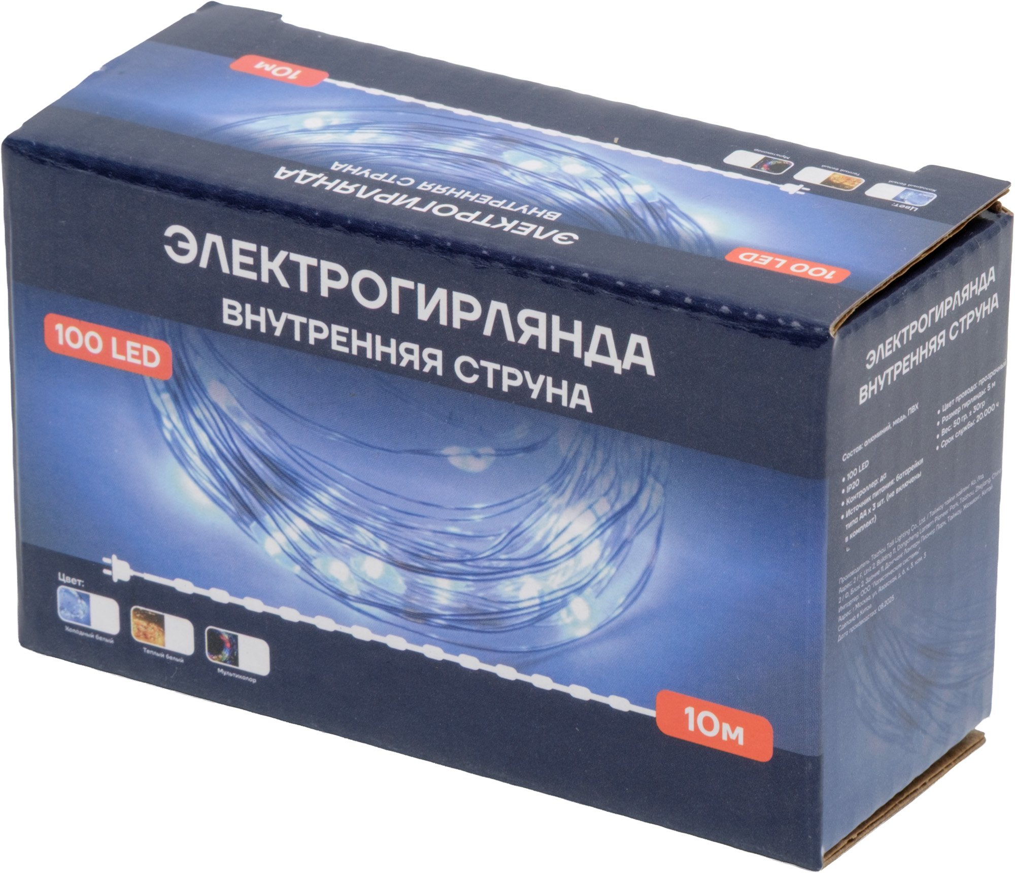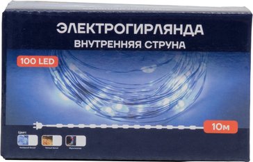 - Электрогирлянда внутренняя Струна 10м 100LED, теплый белый, на батарейках (тип: АА), прозрачный кабель