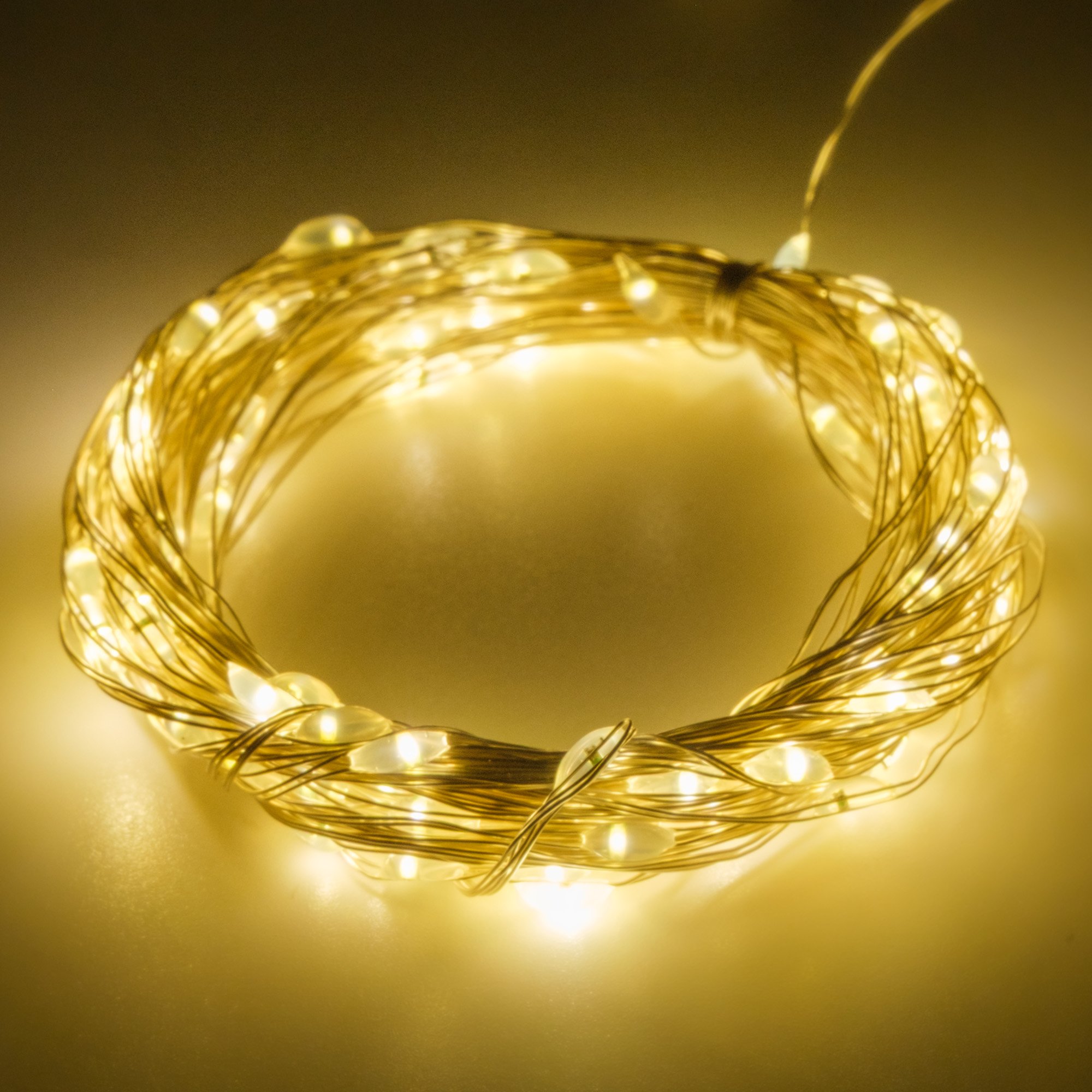 Электрогирлянда внутренняя Струна 10м 100LED, теплый белый, на батарейках (тип: АА), прозрачный кабель