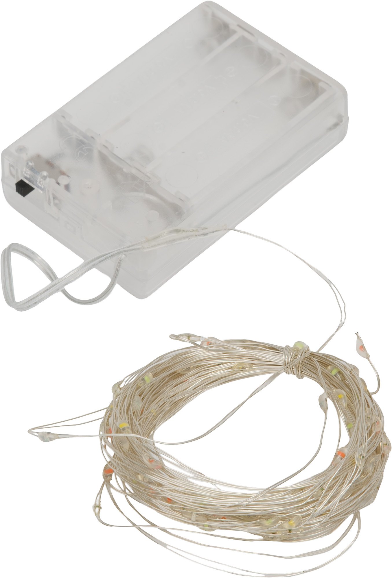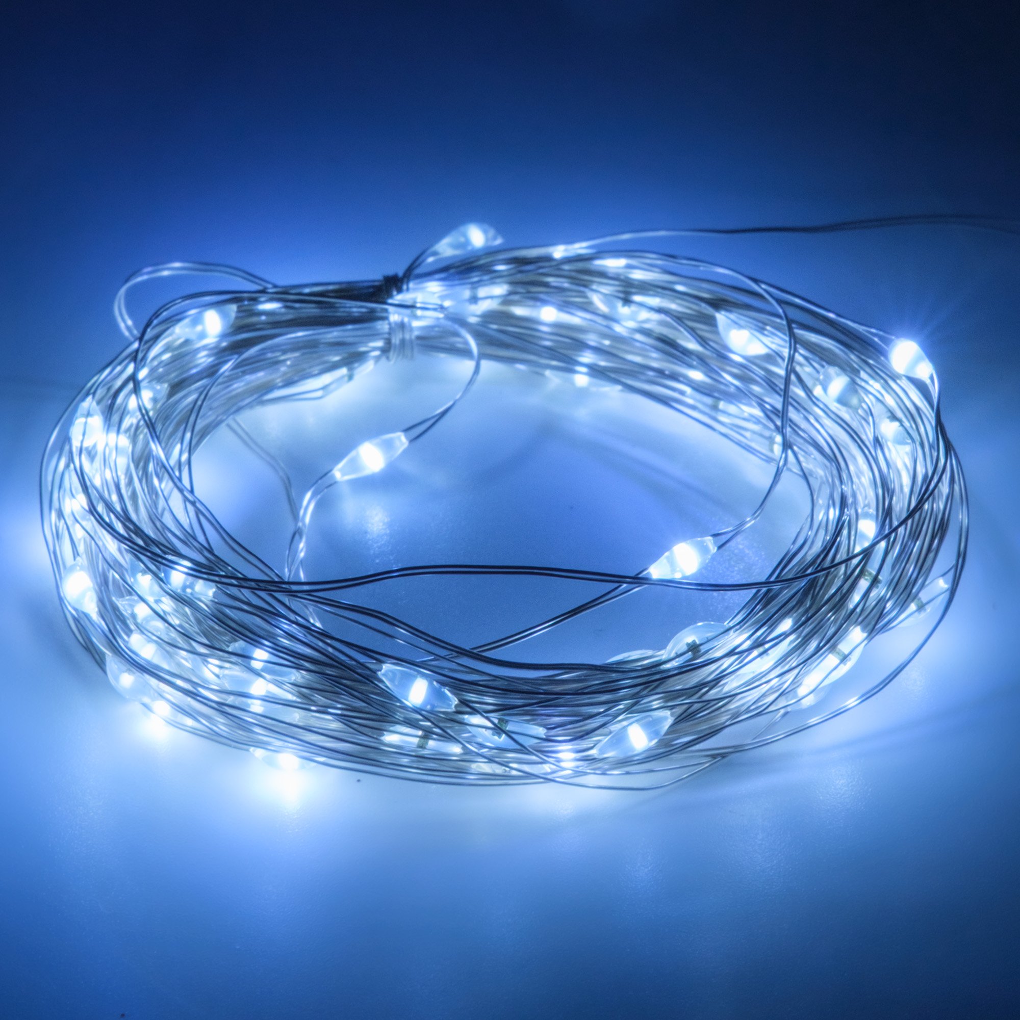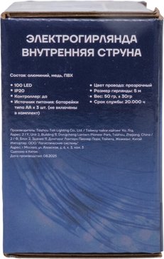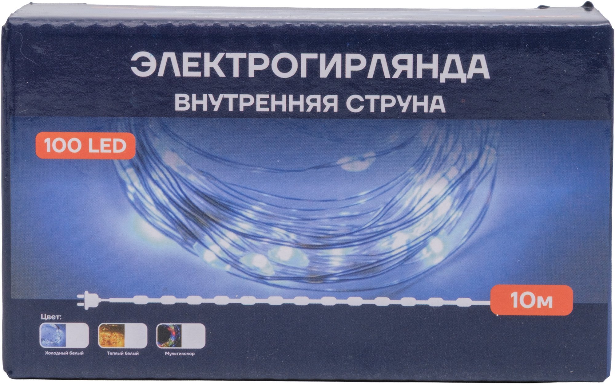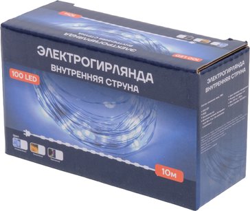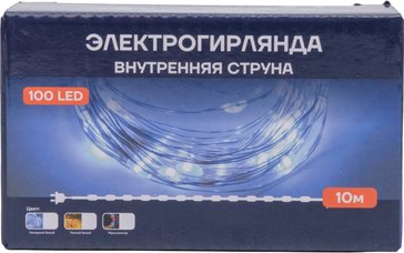 - Электрогирлянда внутренняя Струна 10м 100LED, холодный белый, на батарейках (тип: АА), прозрачный кабель