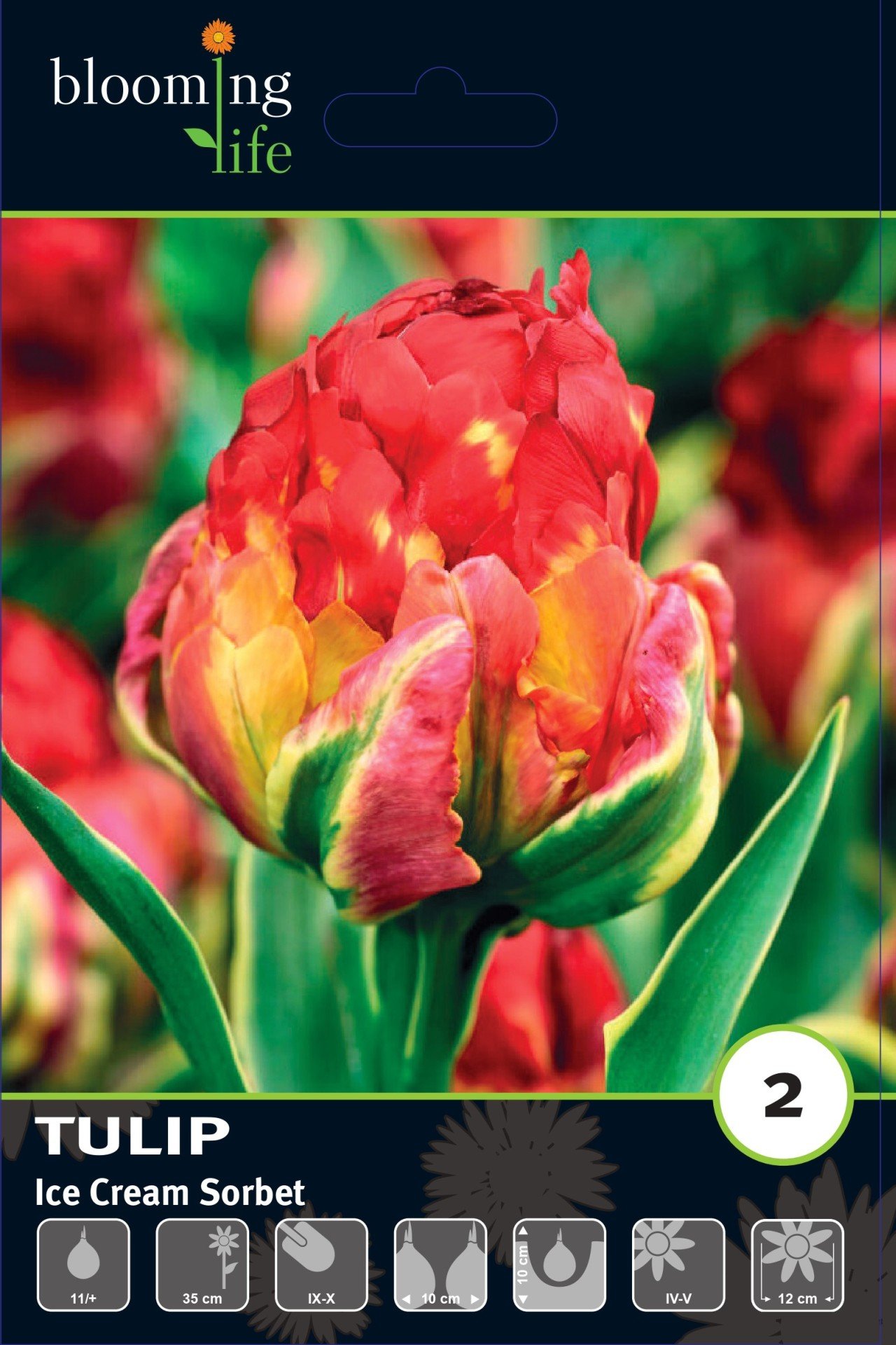 Цветки крупные, благодаря большому количеству лепестков образуют пышные головки, непохожие на классические цветки тюльпана. Верхние лепестки насыщенного красного цвета, нижние — желтые или оранжевые с зелеными прожилками. Диаметр цветка 10-12 см. Высота растения 35-40 см. Период цветения: конец апреля-начало мая. Обширно применяется на срезку, а также для оформления садов и парков.