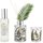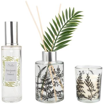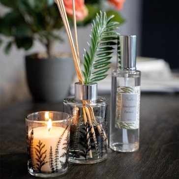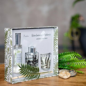 Набор состоит из аромадиффузора объемом 80 мл, ароматического спрея 100 мл, палочек из ротанга в количестве 6 штук, ароматической свечи в стеклянном подсвечнике, декоративной веточки папоротника.