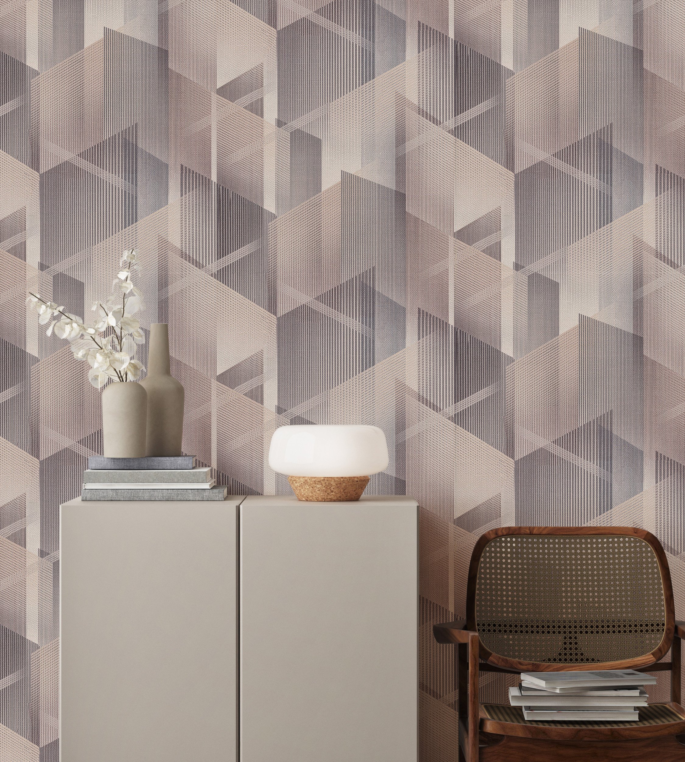 Коллекция обоев «Eclipse» — это игра света, воплощенная в современных геометрических формах. Название коллекции переводится с английского как «затмение» и вдохновлено редким астрономическим явлением — моментом, когда свет и тень переплетаются в идеальном балансе. На полотнах изображён сложный геометрический узор, построенный из пересекающихся граней, линий и полупрозрачных форм. Они формируют объёмные фигуры и выстраиваются в единую динамичную композицию.