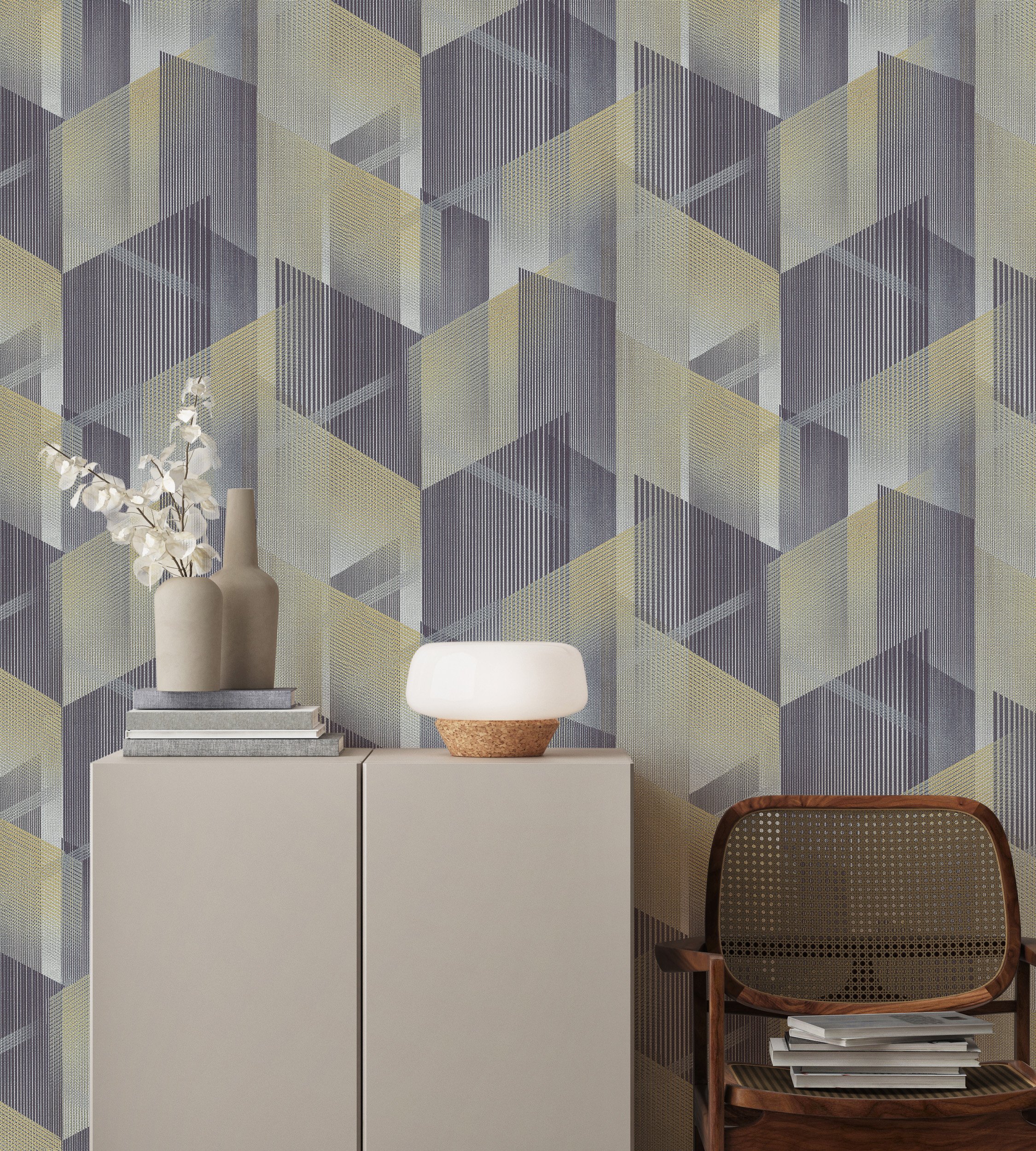 Коллекция обоев «Eclipse» — это игра света, воплощенная в современных геометрических формах. Название коллекции переводится с английского как «затмение» и вдохновлено редким астрономическим явлением — моментом, когда свет и тень переплетаются в идеальном балансе. На полотнах изображён сложный геометрический узор, построенный из пересекающихся граней, линий и полупрозрачных форм. Они формируют объёмные фигуры и выстраиваются в единую динамичную композицию.