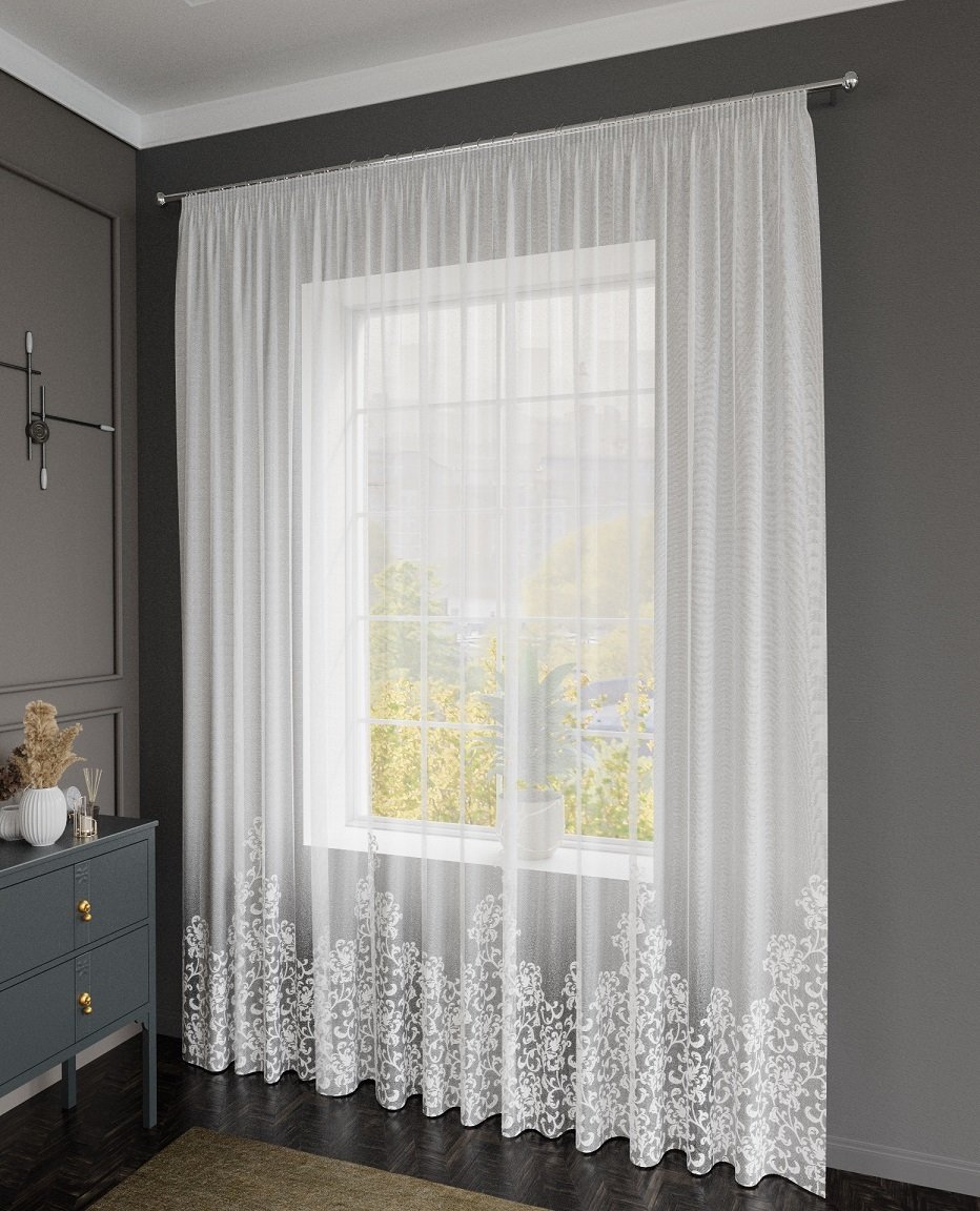 Тюль «Guipure Classic» из белого гипюра с цветочным узором (высота 290 см) — изящное решение для оформления окон. Ажурная текстура и рельефный цветочный орнамент придают изделию утончённый, романтичный вид, создавая в интерьере атмосферу лёгкости и воздушности. Белый цвет визуально расширяет пространство и гармонично сочетается с любыми оттенками и стилями — от классики до современного. Полупрозрачная структура ткани мягко рассеивает свет, сохраняя приватность и добавляя окну выразительный декоративный акцент. Подходит для гостиной, спальни или столовой — везде, где хочется подчеркнуть элегантность интерьера с помощью изысканного текстильного элемента.