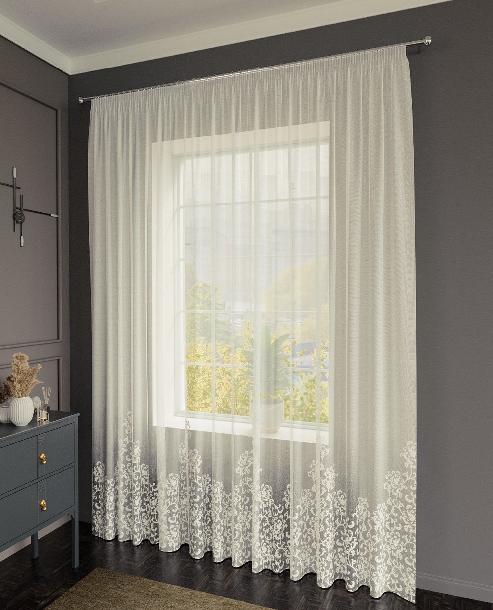 Тюль «Guipure Classic» из бежевого гипюра с цветочным узором (высота 290 см) — изысканное решение для оформления окон. Ажурная структура и рельефный орнамент придают изделию утончённый вид, наполняя интерьер ощущением лёгкости и воздушности. Бежевый оттенок создаёт тёплую, спокойную атмосферу, гармонично сочетается с разными цветовыми гаммами и стилями — от классики до современного. Полупрозрачная ткань мягко рассеивает свет, сохраняя приватность и добавляя окну декоративный акцент. Подходит для гостиной, спальни или столовой — везде, где хочется подчеркнуть элегантность интерьера с помощью изящного текстильного элемента.