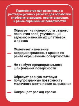 Образует связующий слой между не впитывающей поверхностью и последующими слоями наносимых покрытий.