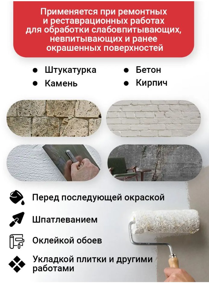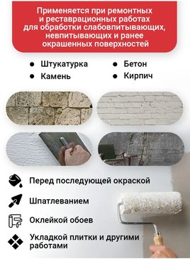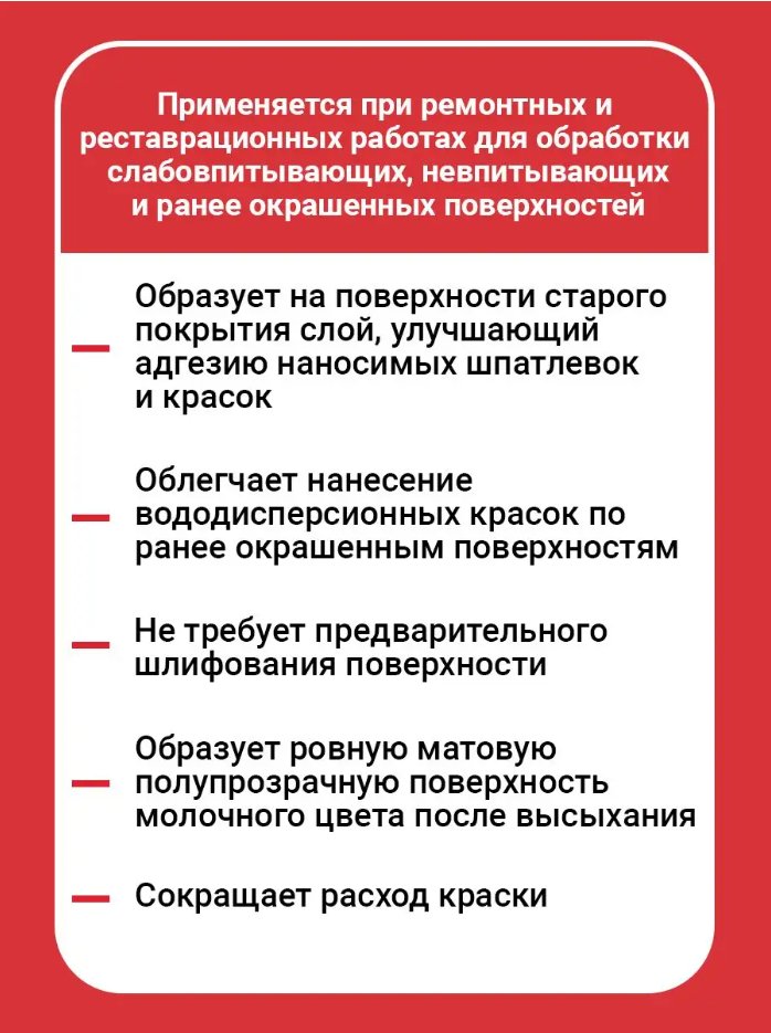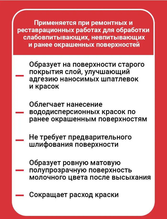 Подходит для внутренних и наружных работ. Облегчает нанесение воднодисперсионных красок по ранее окрашенным поверхностям. Сокращает расход краски.