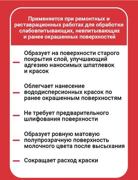 Адгезионный грунт по ранее окрашенным поверхностям - применяется при ремонтных и реставрационных работах для обработки слабовпитывающих, невпитывающих и ранее окрашенных поверхностей (штукатурка, бетон, камень, кирпич, керамическая плитка. и т.п.) перед последующей окраской, шпатлеванием, оклейкой обоев, укладкой плитки и другими работами.