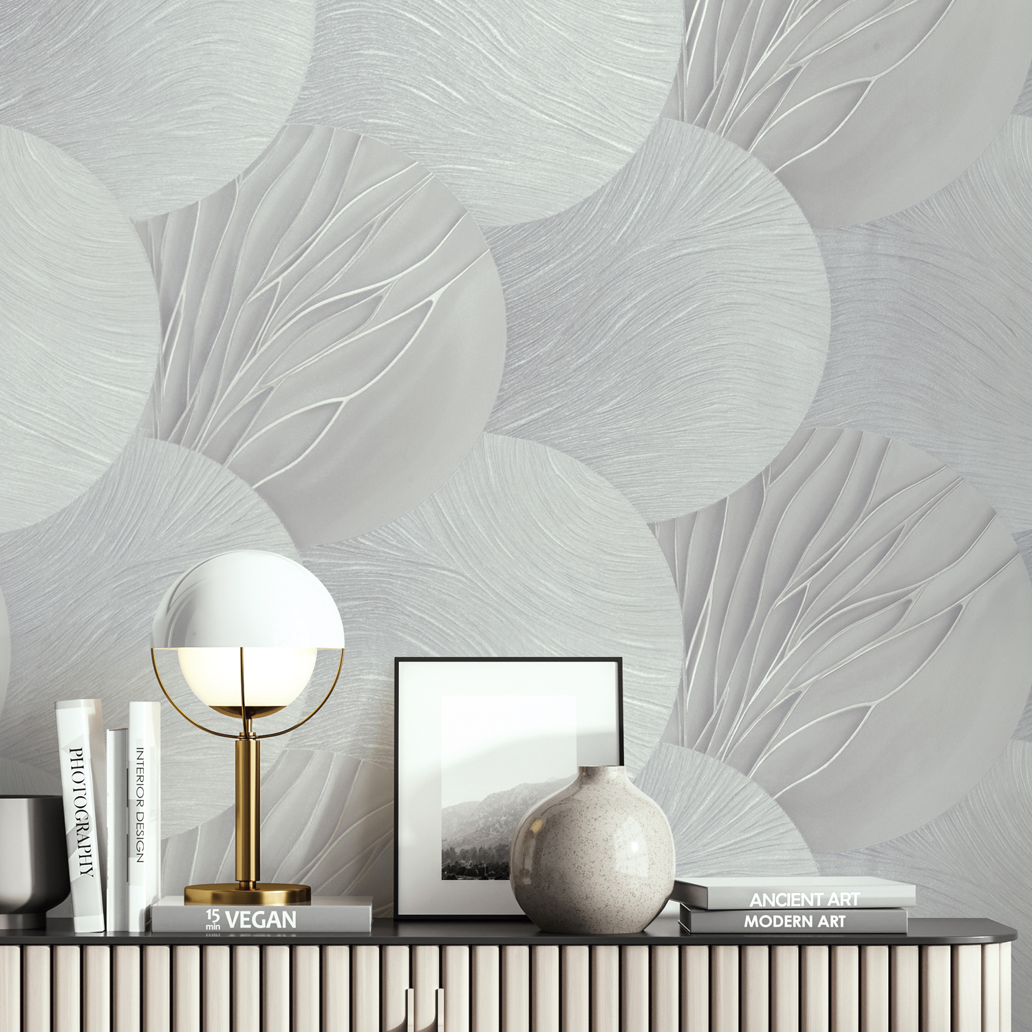 Современные тренды и космическая эстетика в коллекции обоев "Альто". Выразительные круги-планеты с 3D эффектом выполнены в объёмном тиснении. Каждый элемент обладает особой глубиной и текстурой, создавая игру свето-тени.