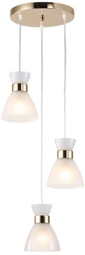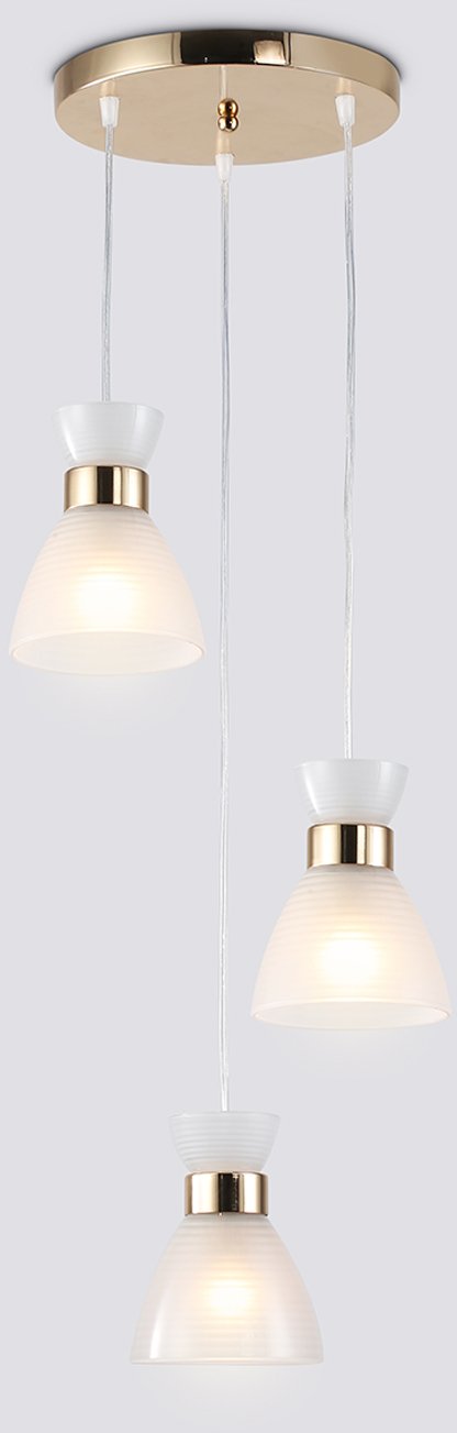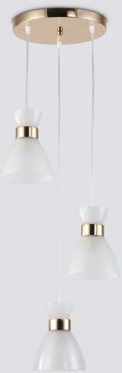 Подвесной светильник TR3402/3 FGD в золотом исполнении — модель из коллекции TRADITIONAL бренда Ambrella Light. Светильник выполнен в стиле неоклассика и сочетает металлический корпус золотистого цвета с тремя белыми матовыми стеклянными плафонами конусной формы.