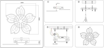Потолочный светодиодный светильник FA543/5 WH (белый) мощностью 104 Вт оснащён радиопультом ДУ (2.4 ГГц) для регулировки яркости, цветовой температуры (3000–6400 К) и включения ночного режима; имеется дополнительная RGB‑подсветка. Габариты — 580 × 560 × 80 мм; световой поток — 7800 лм. Конструкция: металлический корпус и акриловый матовый плафон. Способ монтажа — накладной; подходит для натяжных потолков. Параметры питания: 175–265 В, 50 Гц. Степень защиты — IP20; рабочий температурный диапазон — от –10 до +40 °C. Коэффициент пульсации — 0,2 %; срок службы светодиодов — до 50 000 часов. Гарантия — 24 месяца. Рекомендуемая площадь освещения — до 20 м².