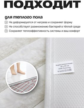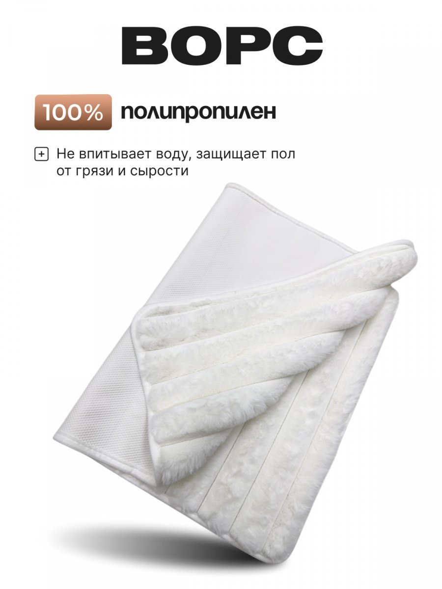 Материал ворса: микроволокно на основе 100% полиэстера. Высота ворса - 1,5 см. Плотность 400 г/м2. Основание: ТПР. Хорошо впитывает влагу, не линяет, не скатывается. Допускается деликатная стирка.