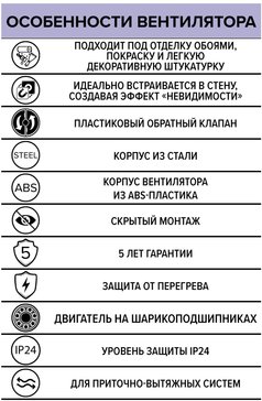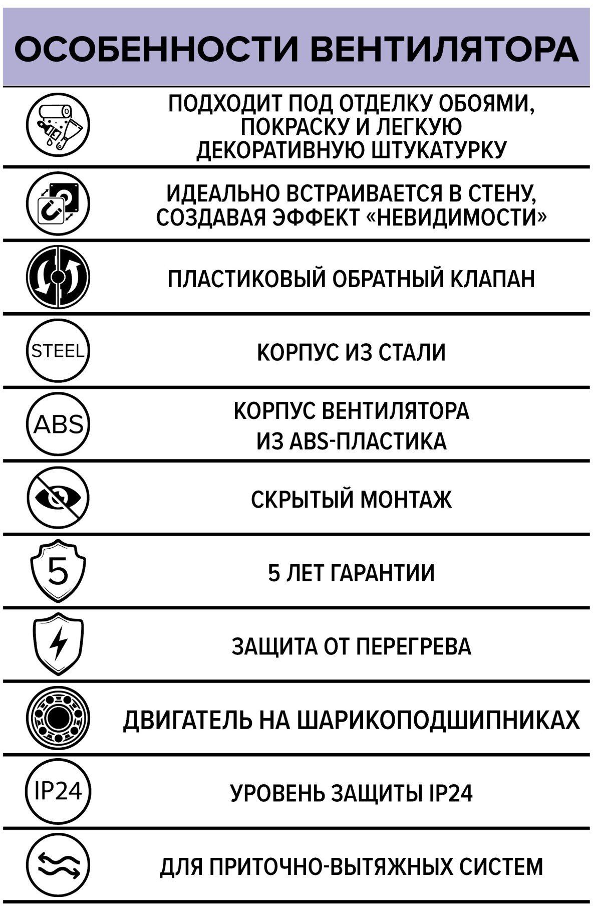 Точность установки и легкость обслуживания: скрытый монтаж: вентилятор устанавливается на черновом этапе ремонта, оставаясь незаметной после финишной отделки. Минималистичный дизайн: после финишных работ остается только тонкая рамка (15 мм). Благодаря минимальной глубине корпуса и компактной декоративной панели вентилятор органично встраивается в стену, сохраняя преимущества полноценной системы в аккуратном исполнении.