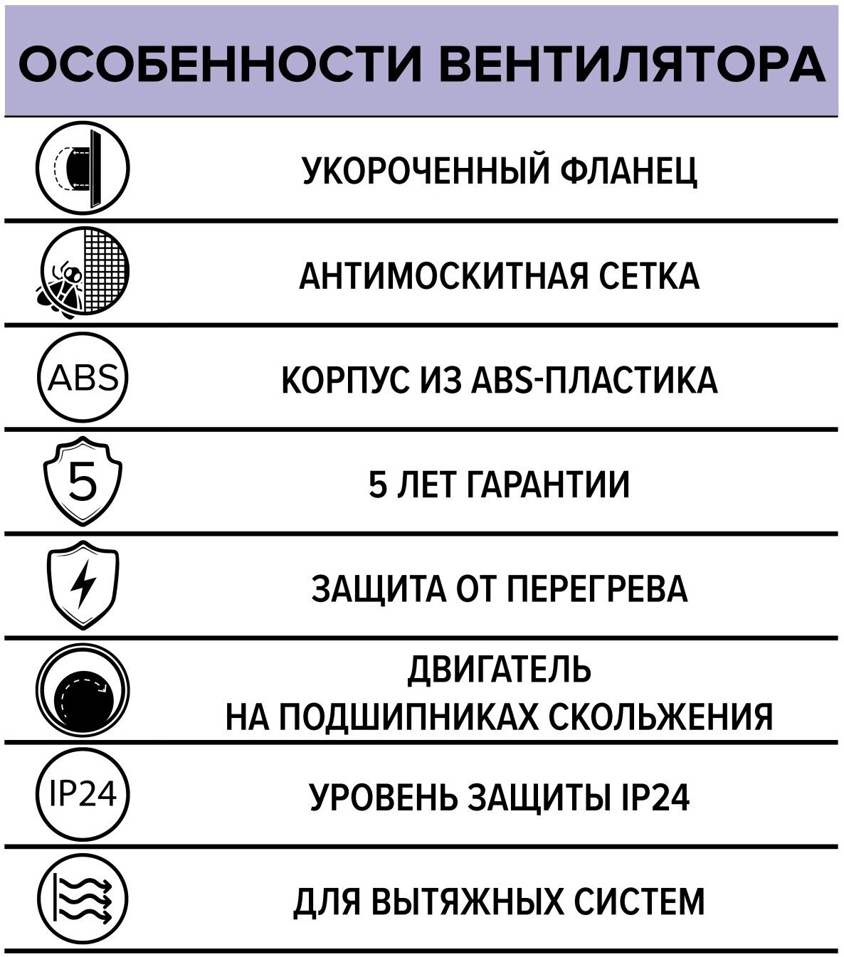 1. Мощная вытяжка. Производительность 185 м³/ч — быстро удаляет влажный воздух и неприятные запахи. 2. Защита от насекомых. Встроенная антимоскитная сетка надёжно преграждает путь насекомым. 3. Тихая работа. Уровень шума всего 36 дБ(А) — не нарушит ваш покой даже ночью. 4. Долговечность. Двигатель с предохранителем гарантирует до 30 000 часов непрерывной работы. 5. Безопасность. Автоматическое отключение при перегреве (свыше +130 градусов) защищает устройство от повреждений. 6. Влагозащита. Степень защиты IP24 позволяет использовать вентилятор в помещениях с повышенной влажностью.