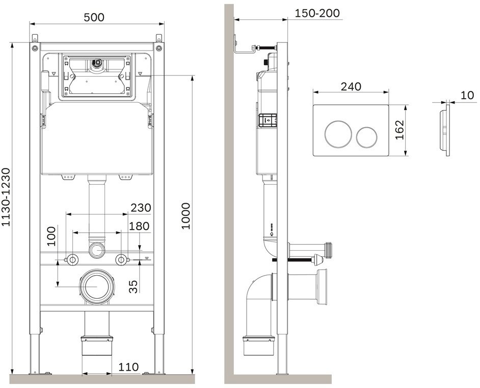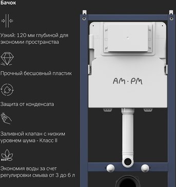 Полностью готовый к установке комплект: система инсталляции AM.PM с белой клавишей, безободковый подвесной унитаз с сиденьем, включающий все необходимые крепления, патрубки, звукоизолирующую прокладку. Ширина рамы составляет 50см. Экономия пространства благодаря узкому бачку – 120 мм глубиной. Заливной клапан с низким уровнем шума - Класс II, согласно европейского стандарта EN 14124.
