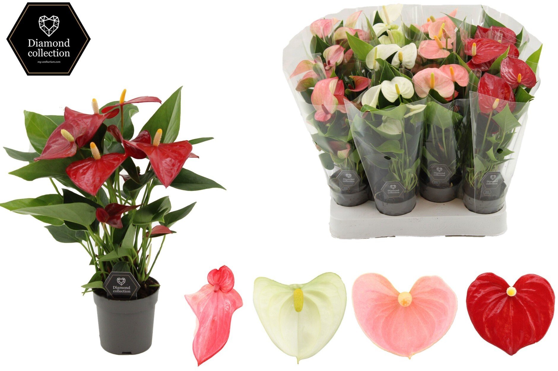 Это коллекция из нескольких сортов антуриума, которые отличаются друг от друга цветом и формой соцветий. В миксе могут быть представлены растения с красными, розовыми, белыми, оранжевыми и другими оттенками цветов.
